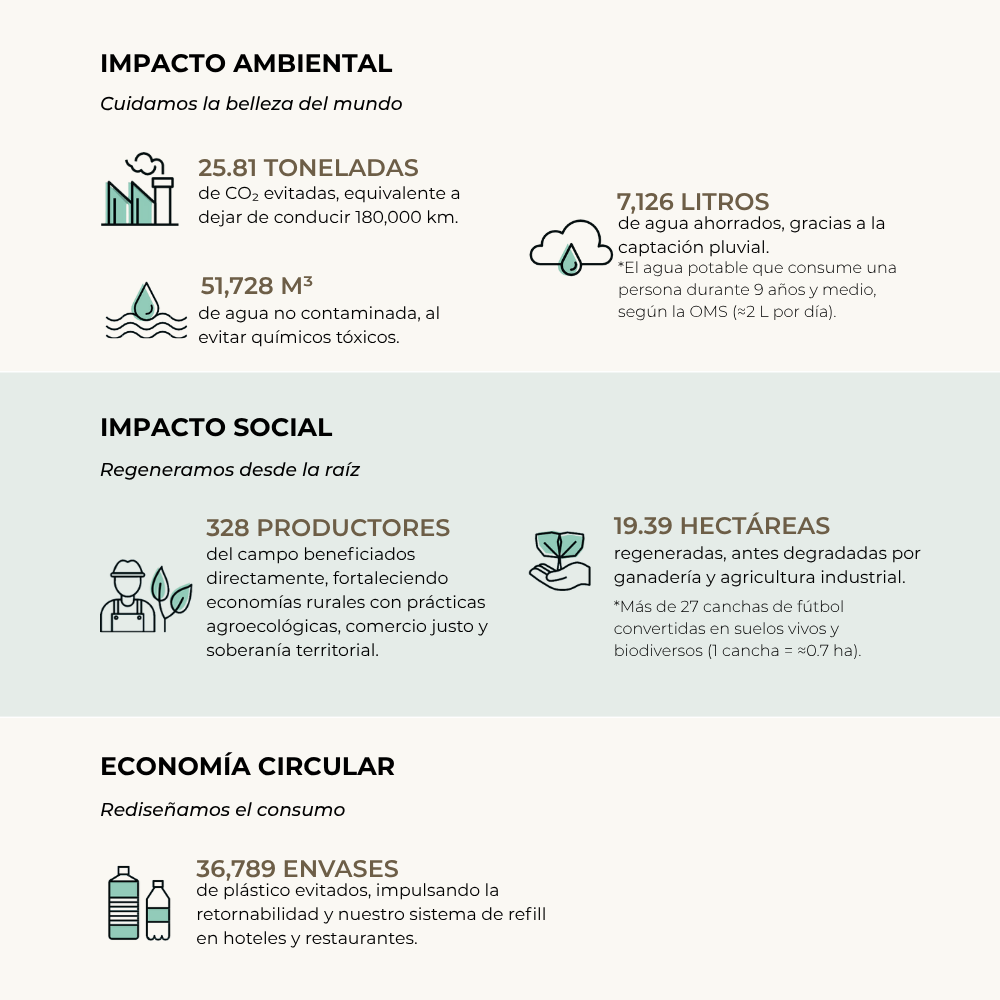 Todas nuestras prácticas sostenibles representan un ahorro de recursos y una reducción significativa de emisiones de carbono. En conjunto, estas acciones nos permiten disminuir nuestra huella de carbono hasta un 700% en comparación con negocios de nuestra misma escala en la industria, colocándonos como una empresa pionera en el cuidado del medio ambiente.